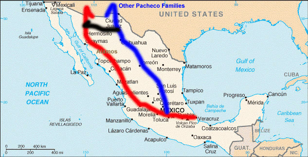 Based on all of the Pacheco Family information so far, this could be the travel line of our Pacheco's from Spain. The blue line is us, the red line are our "cousins". The black line is probable in the middle to late 1600's, because of the gold and silver mining strikes in Nacozari. Also, the native American upraising ousted the Spanish from New Mexico, in about 1680, primarily to Janos.